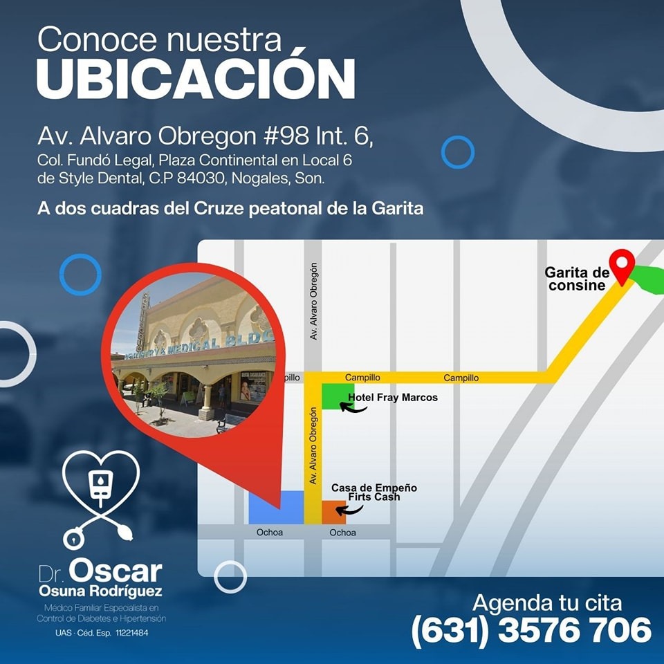 CONTACTO CONTACTO Av Álvaro Obregón #98 int. 6 Fundó legal (Plaza Continental), Centro, Nogales Ir a maps (631) 357 6706 contacto@medicofamiliaroscarosuna.com Oscar de Jesus Osuna Rodríguez - Doctoralia.com.mx